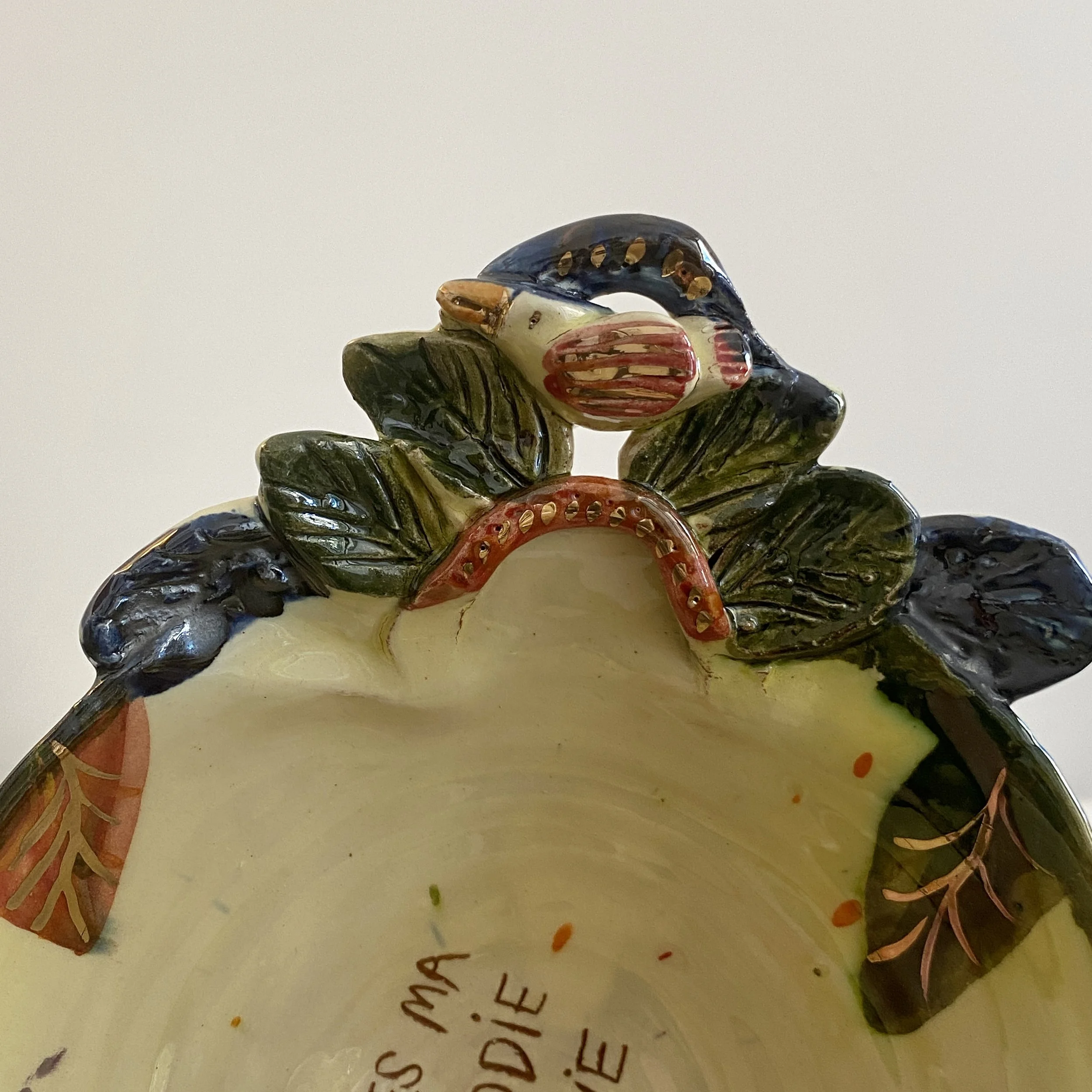 Elle pratique la faïence rouge qu’elle engobe en blanc à cru pour la graver ensuite de mots doux, de chevaux, d’amoureux de couronnes et de fleurs…. Après une première cuisson, elle pose ses jus d’oxyde comme une aquarelle.
