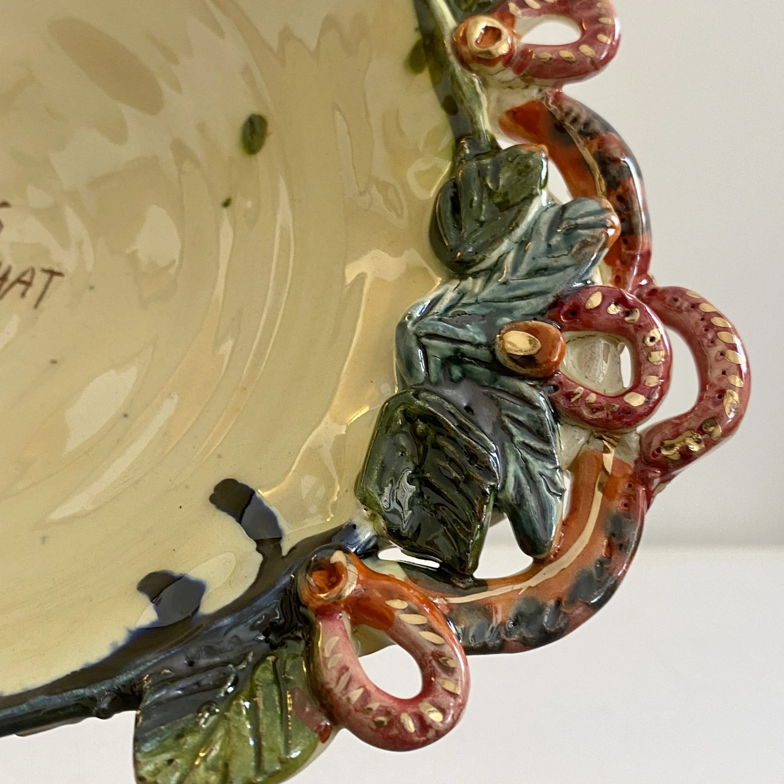 Elle pratique la faïence rouge qu’elle engobe en blanc à cru pour la graver ensuite de mots doux, de chevaux, d’amoureux de couronnes et de fleurs…. Après une première cuisson, elle pose ses jus d’oxyde comme une aquarelle.